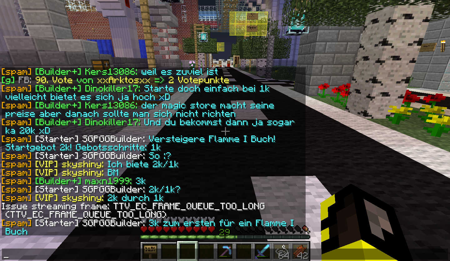 [19:25:54 INFO]: Client> [19:25:54] [Client thread/INFO]: [CHAT] Issue streaming frame: TTV_EC_FRAME_QUEUE_TOO_LONG (TTV_EC_FRAME_QUEUE_TOO_LONG)